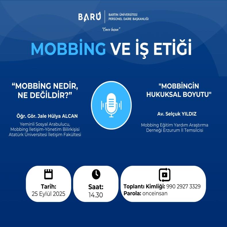 Üniversitemiz ile Bartın Üniversitesi arasında imzalanan Hizmet İçi Eğitim Faaliyetlerinde İş Birliği Protokolü kapsamında 25 Eylül 2025 Perşembe günü saat 14.30'da Öğr. Gör. Jale Hülya ALCAN ve Av. Selçuk YILDIZ tarafından ekte yer alan eğitim programı çerçevesinde çevrimiçi olarak "Mobbing Nedir, Ne Değildir? " ve "Mobbingin Hukuksal Boyutu" konulu hizmet içi eğitimler verilecektir.